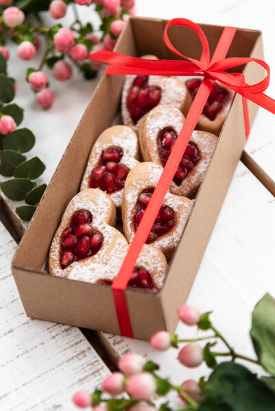 Gránátalmás szívecskék díszdobozba csomagolva.